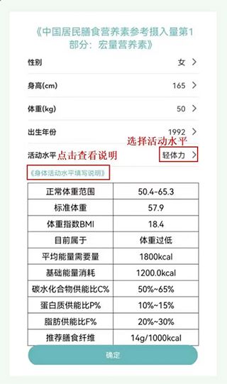 2、填写性别、身高、体重、出生年份等基础信息。点击身体活动水平填写说明,根据表格中信息,选择身体活动性水平