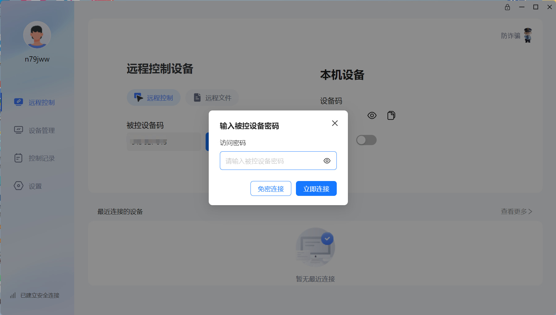 1.立即连接:输入被控设备密码(由被控方提供),点击立即连接,即可发起远程控制