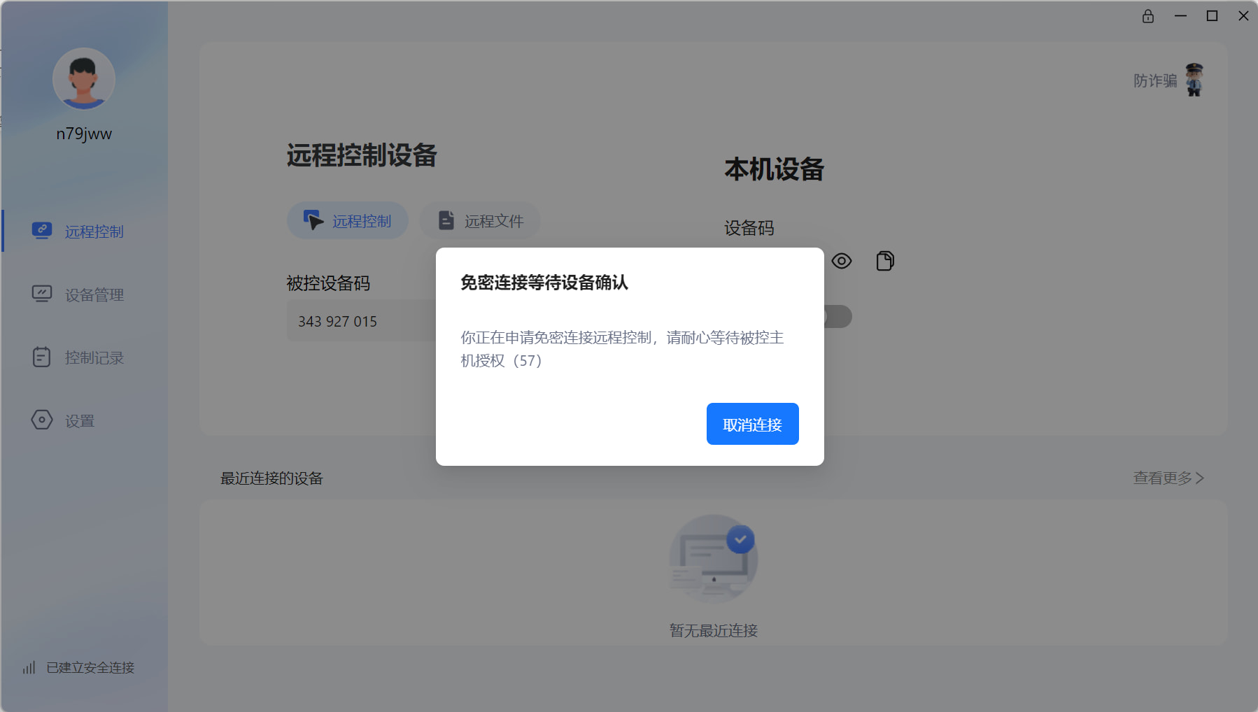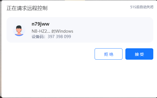 ⒉选择免密连接,需要被控端点击接受,若被控端不接受远控,则远程连接失败