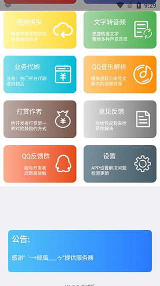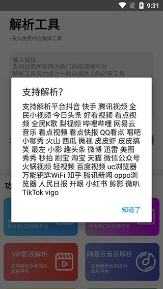 2、点击“解析”就能看到该软件支持的功能,包含快手、抖音、腾讯视频、今日头条等等;