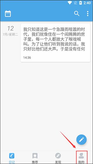 1、打开轻日记app,进入首页,选择“我的”并点击。