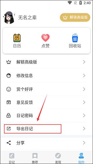 2、进入“我的”页面后,选择“导出日记”。