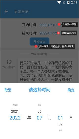 3、选择要导出的日记的开始及介绍时间,最后点击“开始”导出即可。