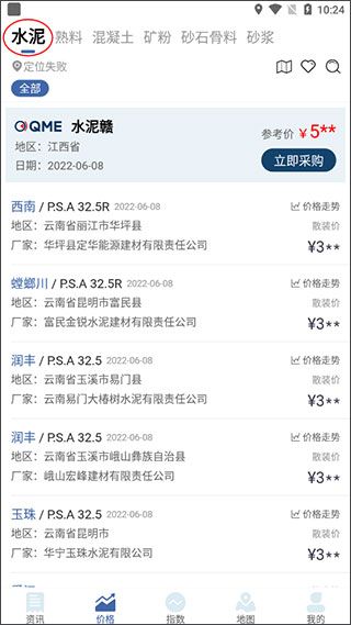 2、点击价格之后,会看到混泥土、水泥、矿粉等不同地区的价格,选择“水泥”这一价格栏。