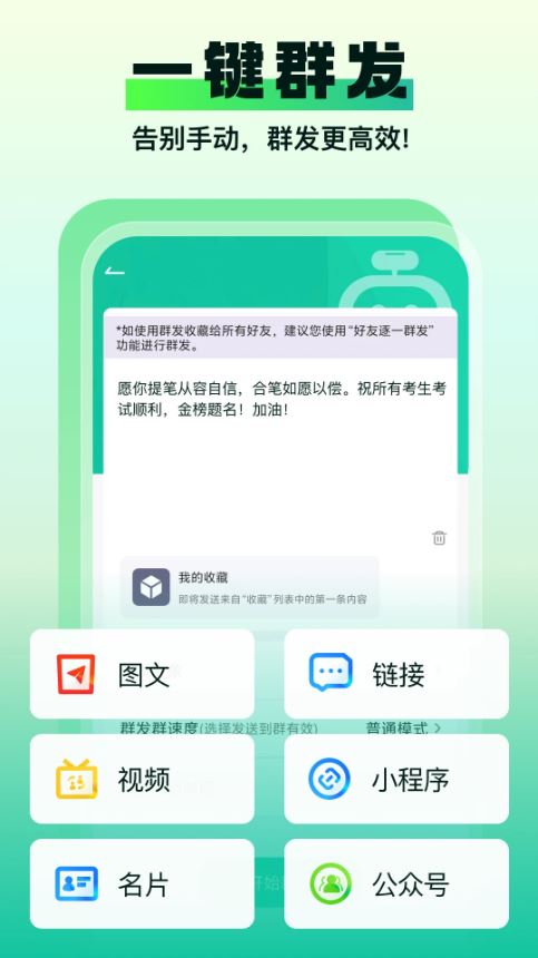 支持文字、图片、链接、视频多格式内容,一键群发至全部好友或指定群组,产品推广、活动通知高效触达,省时又省力。