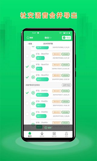 语音合并助手app是一款可以把QQ微信等部分语音转换成mp3文件导出工具,该软件支持微信语音导出,QQ语音导出,公众号语音导出等功能,用户可通过语音的时间进行筛选,找到用户想要的语音更加方便,快捷,筛选出微信语音。并且它还提供合并技术支持,能让每一条语音消息播放内容连贯起来支持一键进行分享和多种保存共享方式,轻松把微信语音分享给想给的人。