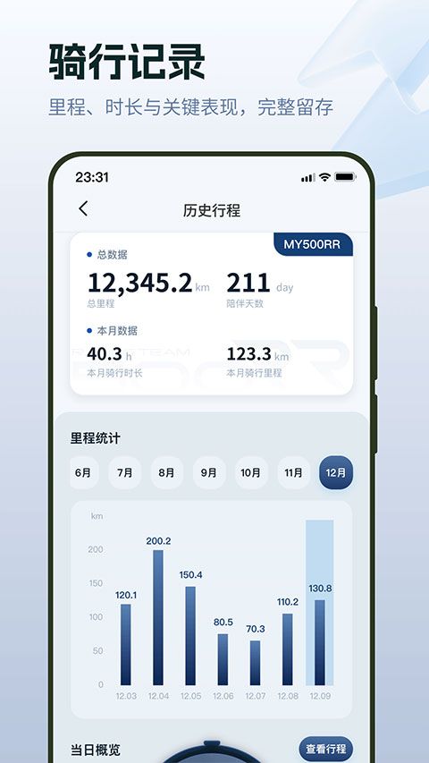 自动记录每次骑行的时长、距离、平均/最高时速、油耗等数据,用户可以随时查看历史骑行记录,了解骑行习惯。
