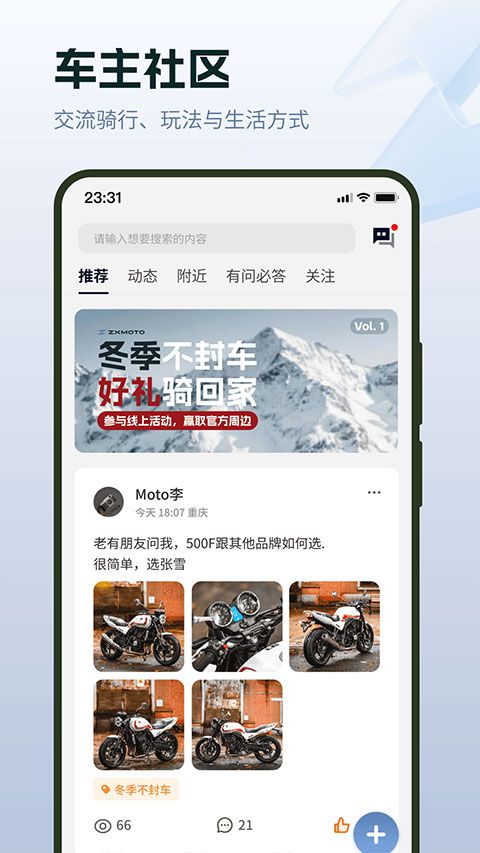 内建有专属社区,摩友们可以自由分享骑行体验、改装技巧和路线攻略,通过点赞评论进行互动,营造出浓厚的圈子氛围。