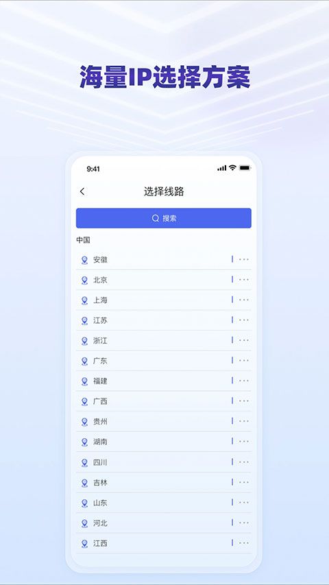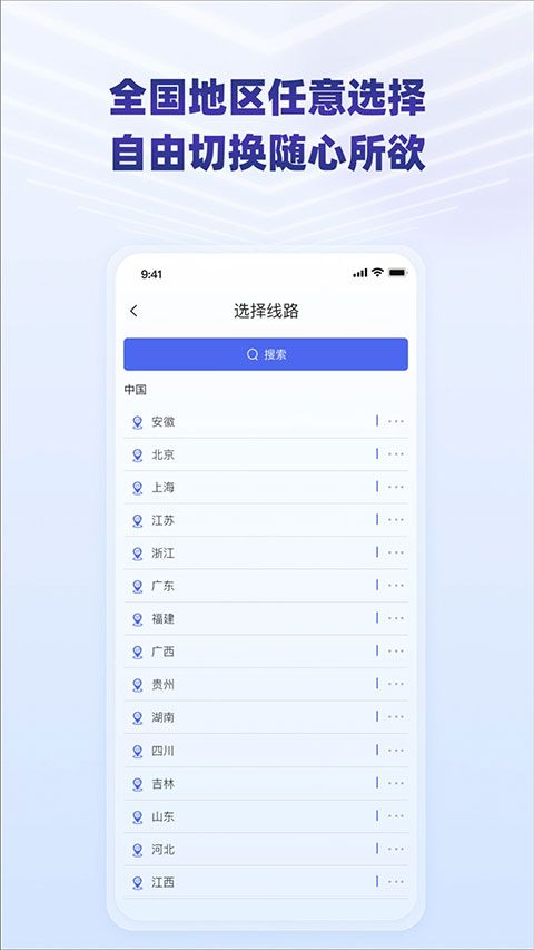 1、app注册登录后选择线路,支持按省份浏览或搜索关键词快速定位节点,操作方式如下: