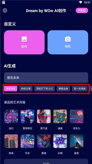1、下载好app后,点击进入,在主页面中就可以直接开始使用。其中最重要的就是关键字,用户可以直接使用软件为你准备的关键字,也可以自己输入,在选择下方的艺术风格,越详细生成出来后就越贴近主题。