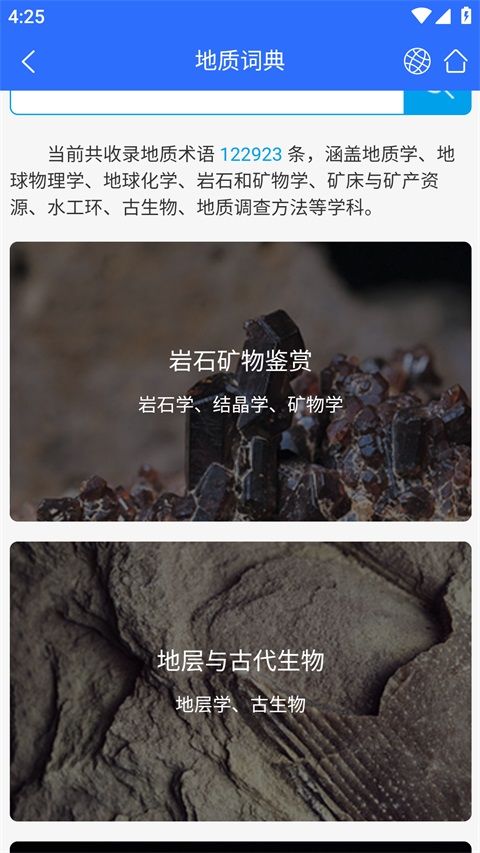 2、地质词典当前共收录地质术语122923条,涵盖地质学、地球物理学、地球化学、岩石和矿物学、矿床与矿产资源、水工环、古生物、地质调查方法等学科。