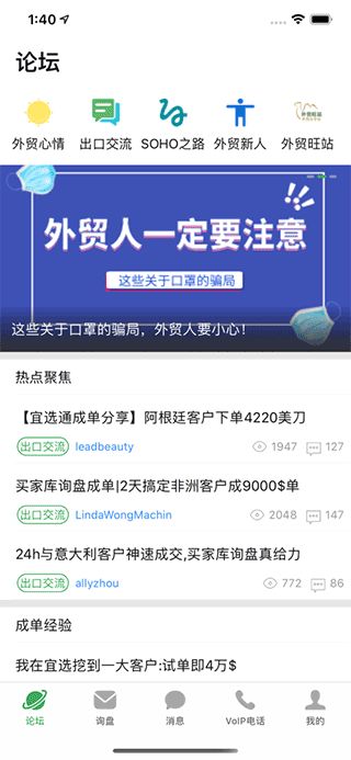 宜选网app是一款外贸应用,实时为用户提供各种外贸行情资讯,了解外贸相关优质的产品,还可以和外贸商家进行在线沟通,支持一键查看询盘、上传产品照片等功能。通过论坛贴吧功能模块,用户可以认识一群和你一样从事外贸行业的小伙伴,和他们分享经验、沟通交流,让你从精彩的帖子中了解更多外贸相关知识。