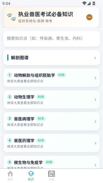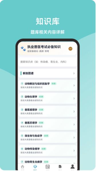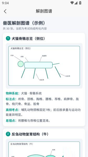搭建执业兽医考试必备知识体系,按解剖图谱、动物解剖与组织胚胎学、动物生理学、兽医病理学、兽医药理学、微生物与免疫学、动物传染病学、动物寄生虫病学等学科分类,沉淀超 80 条 / 类核心知识点。