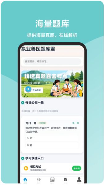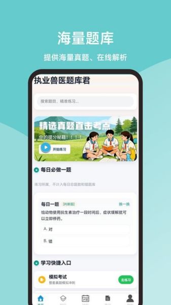 执业兽医题库君APP这是一款拥有独特兽医备考训练和综合题库练习功能服务的应用软件,在这里为备考学员们提供全套的题库测验,轻松进行手机在线模拟测验、章节练题、随机题库测验、专项训练以及重要知识点巩固讲解等;而且该平台还拥有实用的学习笔记工具,轻松将易错题和难题添加笔记,方便用户后续不断的练习与强化巩固;除此之外,在执业兽医题库君手机版软件APP当中还拥有个性化的学习辅助工具,更多有趣的学习工具轻松体验;对这款软件感兴趣的朋友们千万别错过,赶紧来本站下载体验吧。