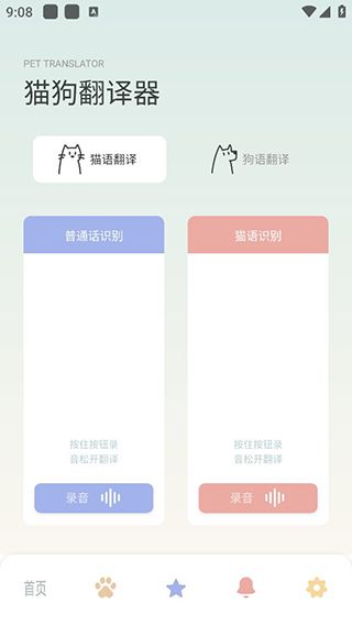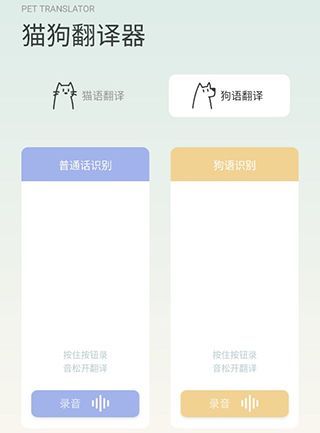 用户在首页可以直接使用狗语和猫语翻译器,将你想说的话点击录音即可自动翻译并且播放,以及狗狗或者猫猫说的话录下来进行翻译。