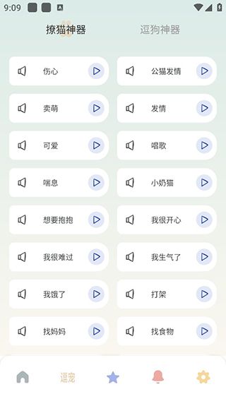 用户点击下方宠物爪印图标即可进入逗宠页面,里面有撩猫和逗狗神器,有许多猫猫狗狗的语言录音,可以播放使用。