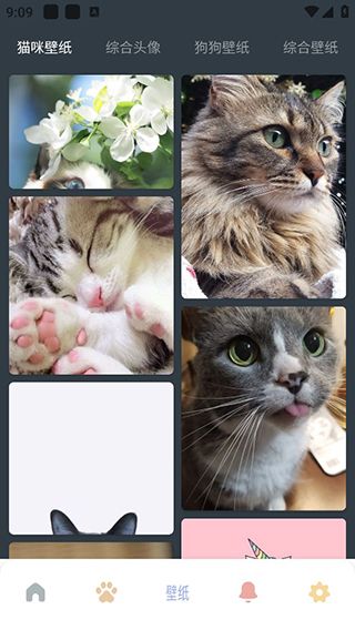 用户点击下方五角星按钮即可进入壁纸界面,有猫咪壁纸、综合头像、狗狗壁纸、综合壁纸等壁纸内容可以下载使用。