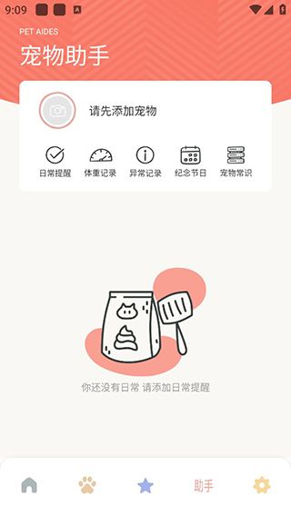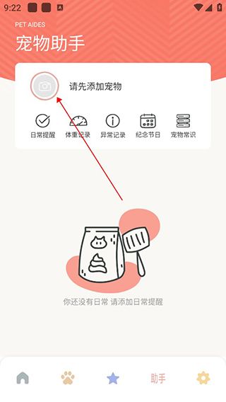 用户点击下发铃铛图标即可进入助手页面,点击可以添加宠物,可以记录宠物的体重、异常等,还可以查看宠物常识。
