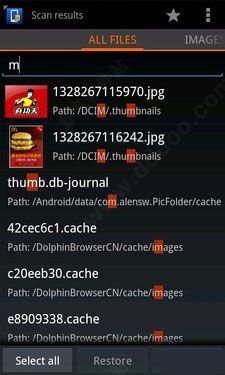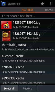 该软件花费少量时间,将手机存储器中所有曾经被删除掉的文件,全部都重新找回来,当然这些文件都是用户单纯在手机存储器中(SD卡)中无法看到的。在这里该软件将所有找回的文件分为具体五个类别(类别的具体介绍前文已讲述),供用户更精确查找。