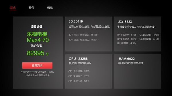 安兔兔评测tv版是一款专业、好用的手机性能评测工具,他的测试结果将全面评估手机性能,非常值得信赖,然而在智能电视普及的今天,安兔兔评测能否也支持电视性能测试呢?这是一款集硬件检测、跑分和测试结果为一体的验机神器,虽然功能体验上没有安卓apk丰富,但评分规则、测试项目和手机版基本一样,用户可以通过安兔兔电视评测,检测电视的综合性能、3D游戏性能、系统流畅度、CPU性能以及RAM性能。另外,软件在UI设计方面,完全尊重电视系统的交互逻辑,用户仅凭遥控器就可以完成所有测试流程。最后,软件界面分为测试、排行和信息三个部分,测试部分完全展示跑分,排行部分展示产品的性能排行,信息部分则展示电视的主要配置等。