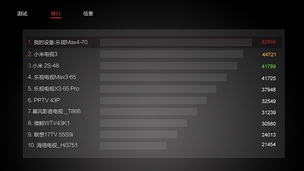 4、性能排行:软件内设有排行页面,展示了主流电视的运行成绩,用户完成测试后可以看到自己的排名,方便用户进行性能对比。