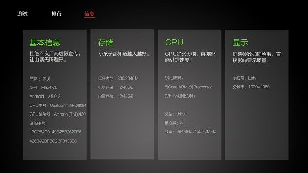 用户在完成跑分之后,测试页面会给出设备的各项成绩,并且会对各项成绩加以说明,让用户知道分值是根据什么算出来的。
