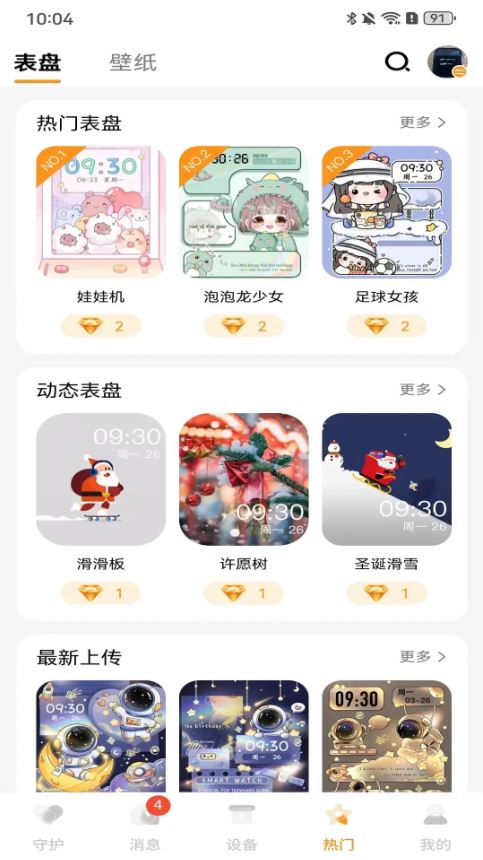 数字表盘、卡通动漫、热门推荐、精品壁纸、最新上传、简约表盘。