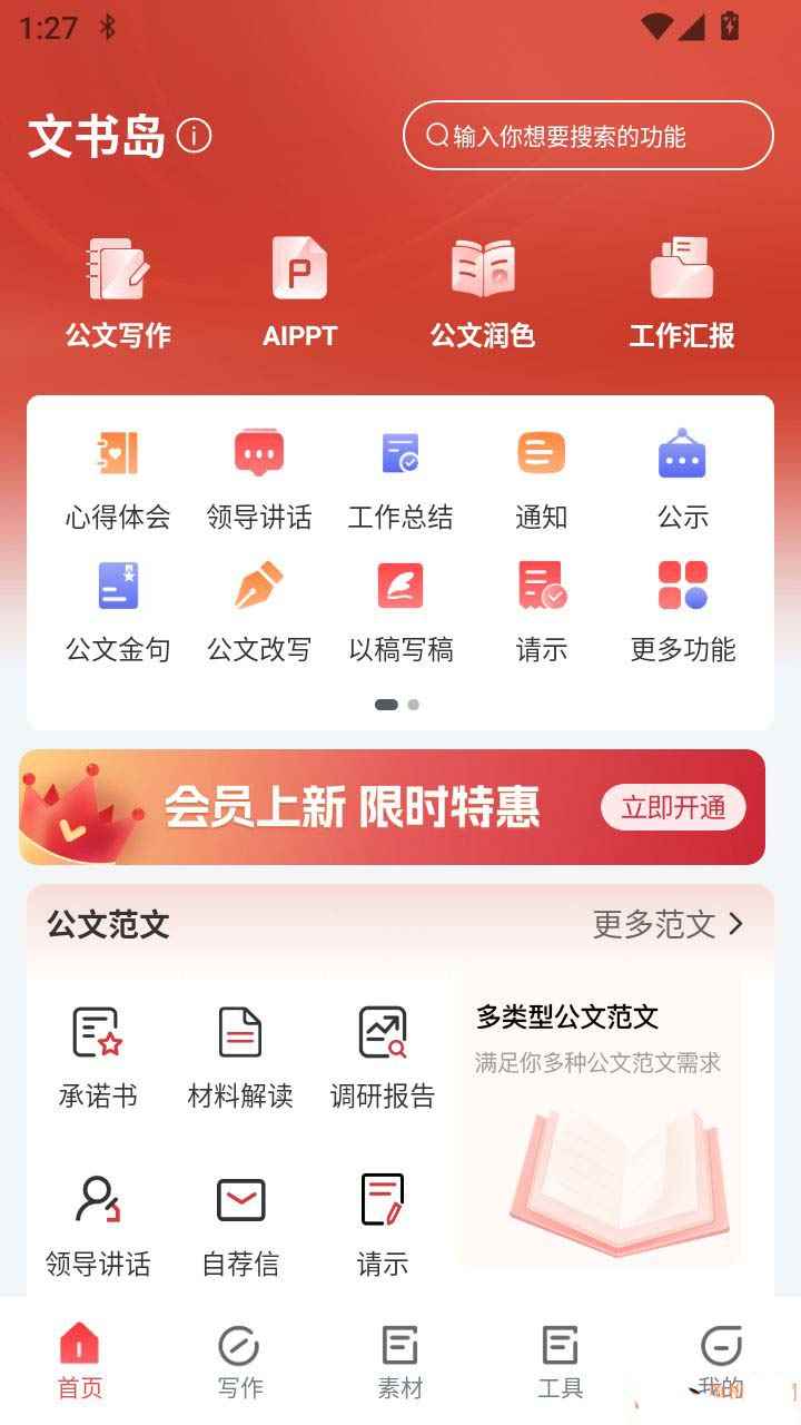 文书岛APP是一款能帮助用户高效提升办公和写作效率的AI创作软件,有效采用非常先进的智能AI技术,旨在让所有企事业单位工作人员都能高效完成诸多公文内容创作,不用自己费劲脑汁的想,根据自己的需求输入描述词即可快速生成,帮助你获得需要的公文内容更简单方便。文书岛官方版还为用户准备看诸多公文模板和素材资源,可自由在线查找和选择使用,完成公文写作更加轻松便利,享受贴心的服务。此外;APP还有诸多简单实用的AI智能工具箱服务,满足文档格式转换、录音转写和文字提取等多样需求,有需要的用户快来下载体验吧!