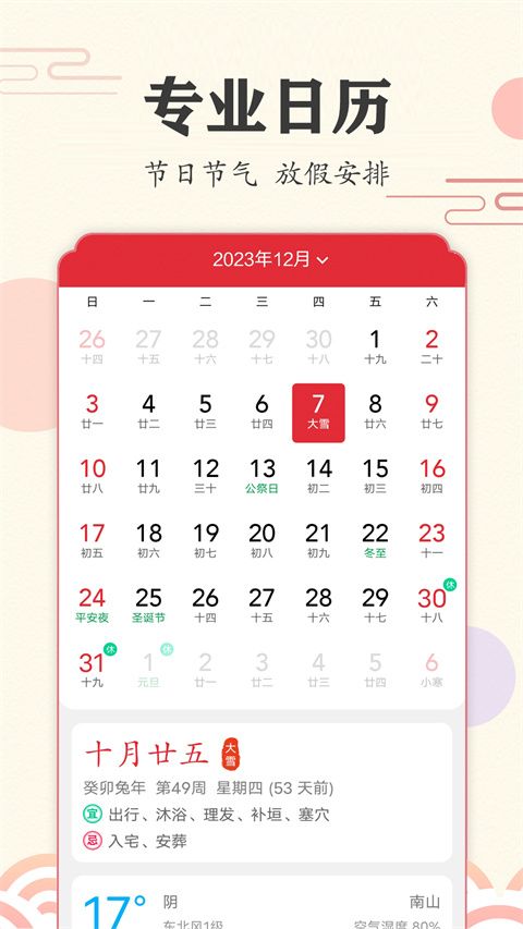 提供公历、农历、黄历、日程、天气、记事、生日、节日、星座、解梦、生理规律等国人生活息息相关的实用功能。