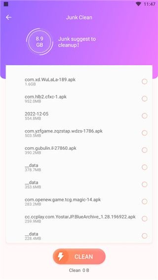 1、下载好app,点击进入,软件以极简画风设置,直接点击【CLEAN】即可开始扫描手机垃圾。
