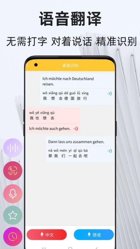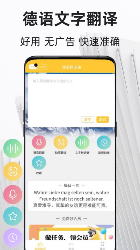 德语翻译通app是一款专注于德语翻译和学习教育功能服务的软件,在这里配备多种翻译识别功能,轻松即可相机拍照文本翻译、语音识别翻译、文字语音转换翻译、词典翻译等等操作,帮助用户轻松实现德语精准翻译解析,以后大家进行德语翻译识别操作将十分效率。有需要的朋友可在本站下载使用!