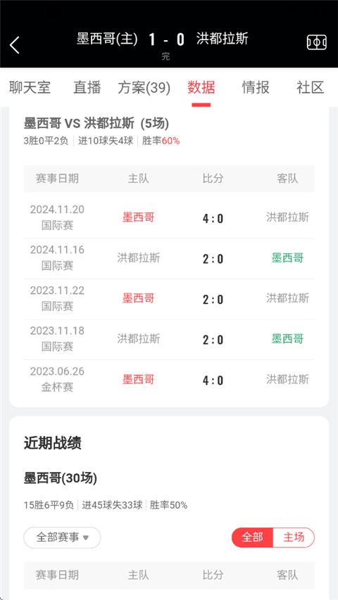 4、当比赛结束后,用户可以点击数据查看双方近期战绩。