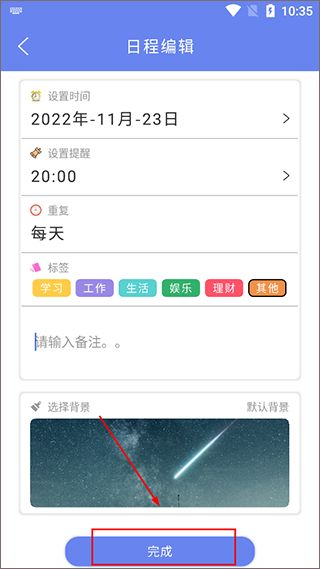 2、在【日程编辑】页面,根据自己的规划来设定自己的计划,设定完成,点击【完成】即可。