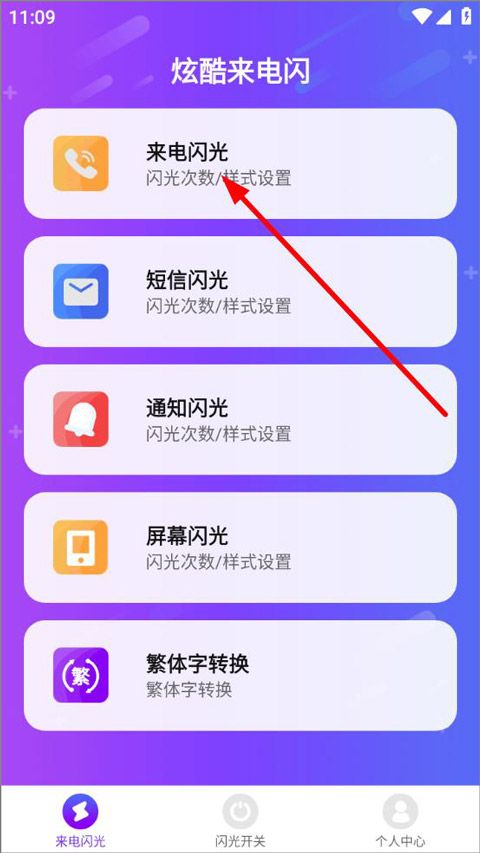1、打开炫酷来电闪光灯app,进入主页,主页有来电闪光、短信闪光、通知闪光、屏幕闪光、繁体字转换等功能,点击来点闪光;
