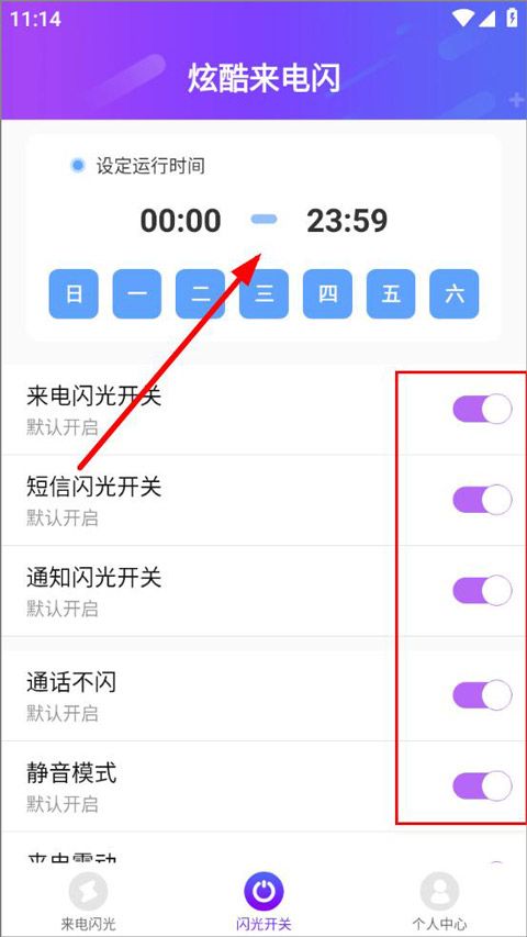 3、用户也可以打开闪光开关页面,设定运行时间,打开来电闪光、短信闪光、通知闪光等开关即可。