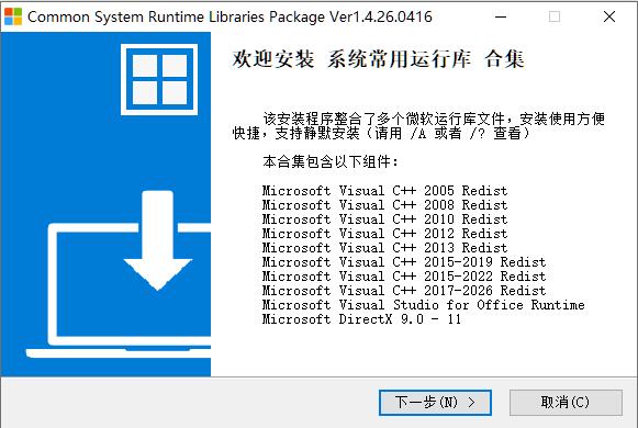 CSRLPackage是一个系统常用运行库合集,一键装齐Windows运行库,集成了完整无精简 Visual C++ 2005 – v14(2026) 和 Microsoft DirectX 9.0 – 11 运行库、Office Runtime等。以官方组件打包、自动适配与批量部署 ,大幅降低装机与软件维护的时间成本,适合普通用户、装机人员与运维人员快速配置系统依赖环境。