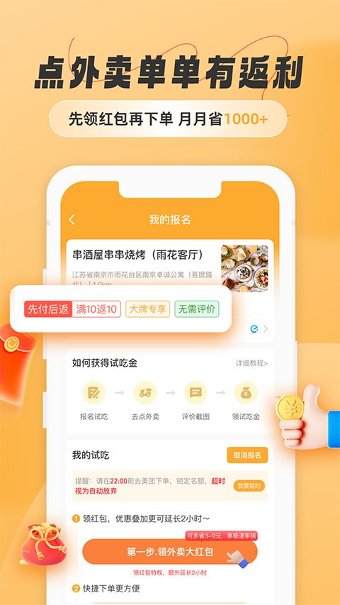 3、同时,每日10:00/16:00开放限时捡漏频道,爆款商品低至3折,结合“满10返10”“先付后返”等霸王餐试吃活动,进一步降低消费成本。