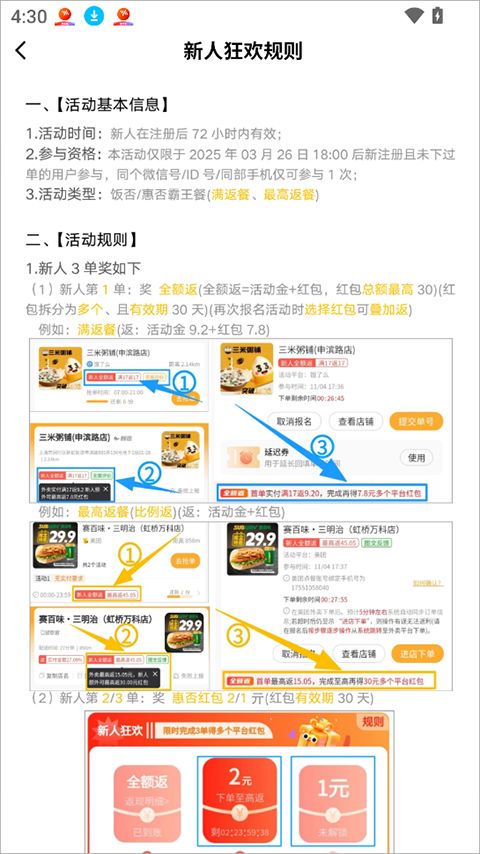 6、新人特权:新人注册即可享受专享优惠活动,如大额优惠券领取,显示免单等操作;