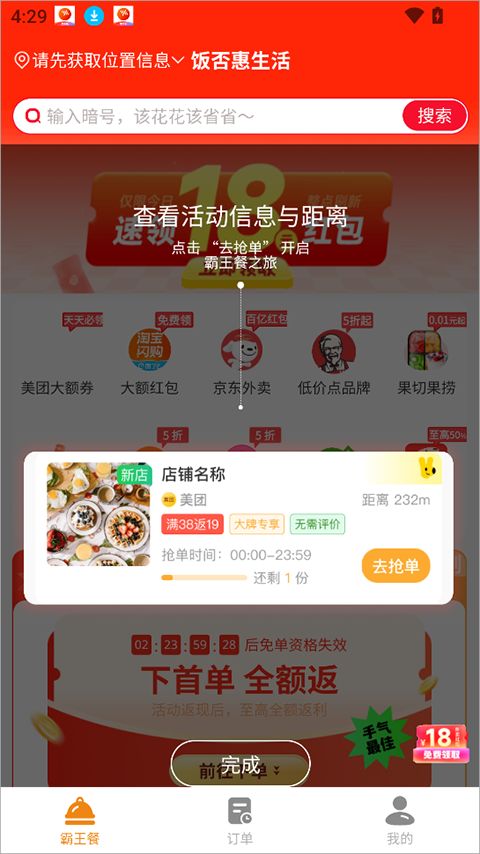 1、打开登录饭否霸王餐app新人用户可以享受三单活动奖