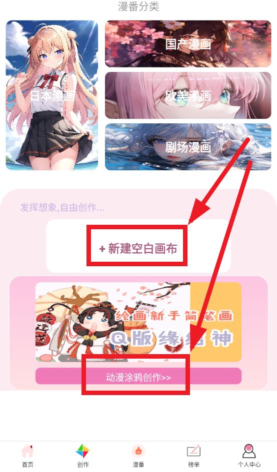 1、点击新建空白画布或动漫涂鸦创作。