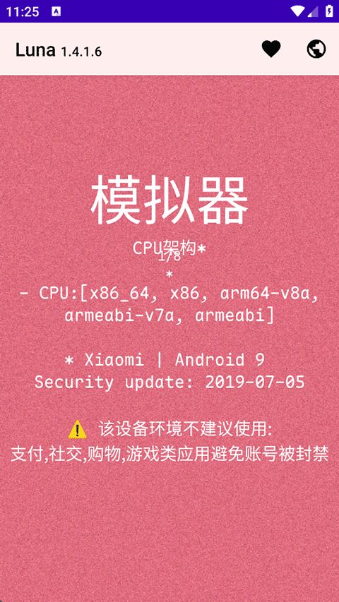 Luna是一款功能全面的安卓设备检测解决方案,集硬件信息诊断、系统安全评估与反欺诈检测于一体环境检测工具。其核心功能涵盖手机型号、版本、Root权限、Bootloader状态等硬件参数的深度解析,可精准识别翻新机、模拟器及虚拟机环境,为设备真实性提供技术背书。目前Luna环境检测工具主要是在小米手机搞机界比较知名,让安卓搞机玩家们能够在启动面具框架magisk中的隐藏root功能后,使用该环境检测工具将一些应用中的root检测进程完全冻结掉,能够顺利过检测,以便在已root的真机或虚拟机设备上的应用能够正常运行,有需要的用户可以在本站免费下载使用。