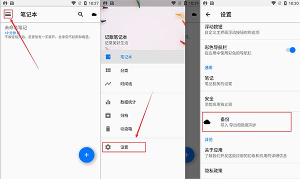 1、打开笔记本清墨app,进入备份页面(两种方式)