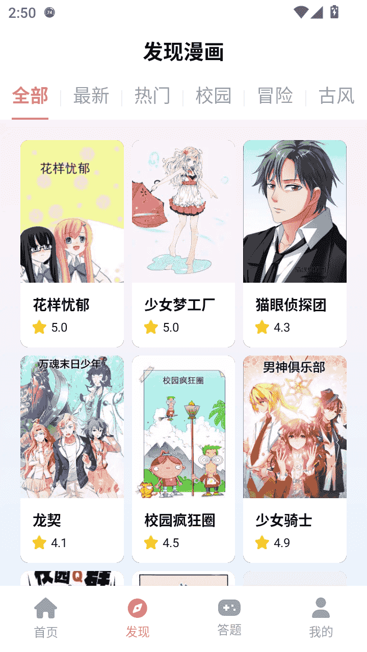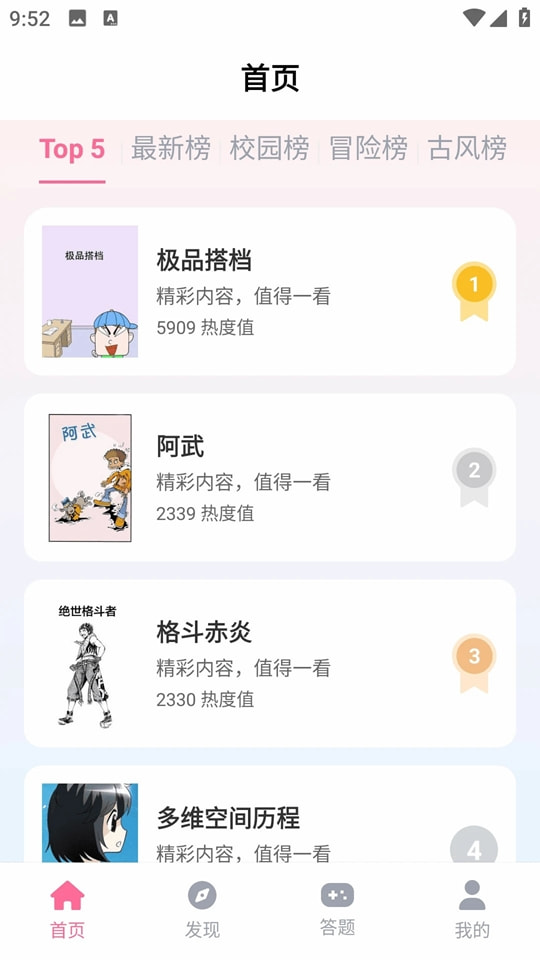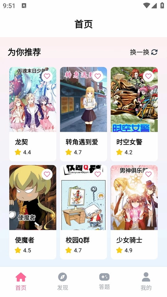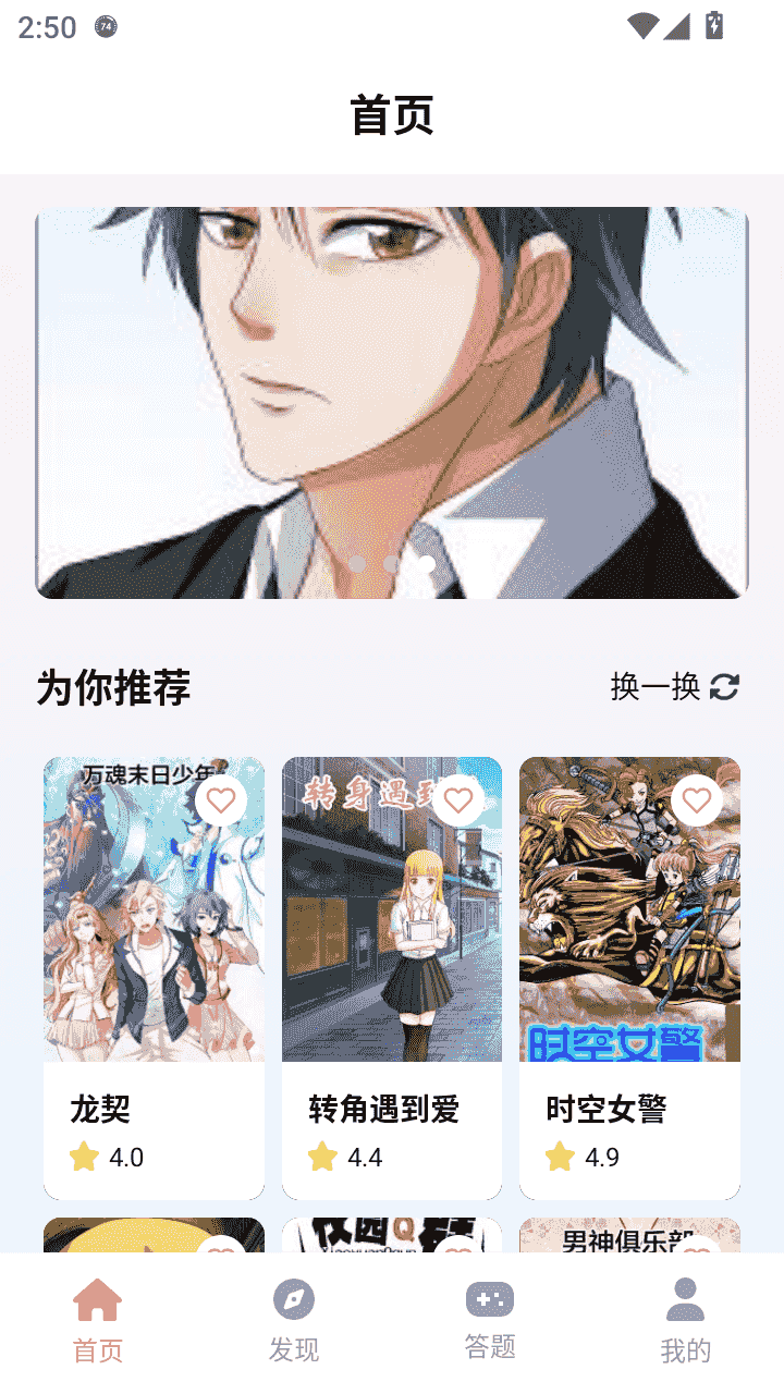 一耽女孩是专为动漫爱好者打造的追漫软件,你可以在首页发现各类优质漫画,还有趣味动漫答题玩法,通过剧情描述猜动漫名,检验你的阅片量,浏览历史会自动记录,方便你随时续读,是追漫和巩固动漫知识的实用工具。