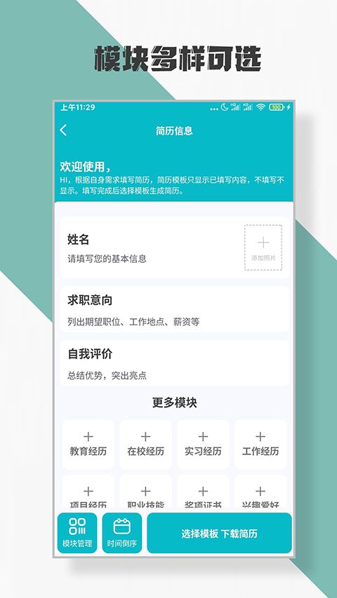 简历制作app是一款易用简历制作软件。相信大家在找工作的时候都写过简历吧,也知道一份好的简历能为你拿下不少的好感度,毕竟简历是描绘你所具备的硬性条件,如果你的模块描绘不清楚的话,用人单位也会过滤掉你的简历的呢,毕竟用人单位不可能纠结于一份描绘不清的简历呢。