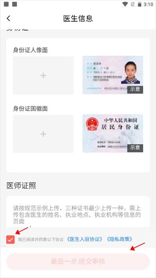 3、这时候就需要上传自己的身份证信息和自己的医生执照证件,上传成功之后就到最后一步等到系统审核了,如果审核通过的话就可以认证成功了。