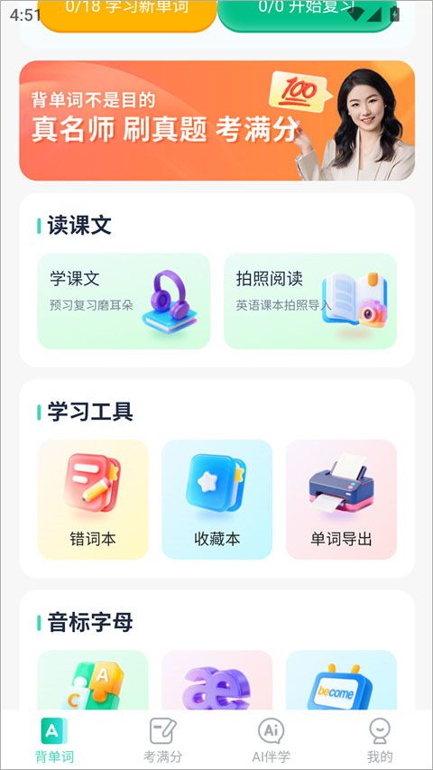 全面兼容校内外各种词书的学习:包括小学、初中、高中各学段的150+教材,紧跟新课标迭代更新;涵盖KET / PET / 考研 / 四六级 / 出国考试等校外词书。