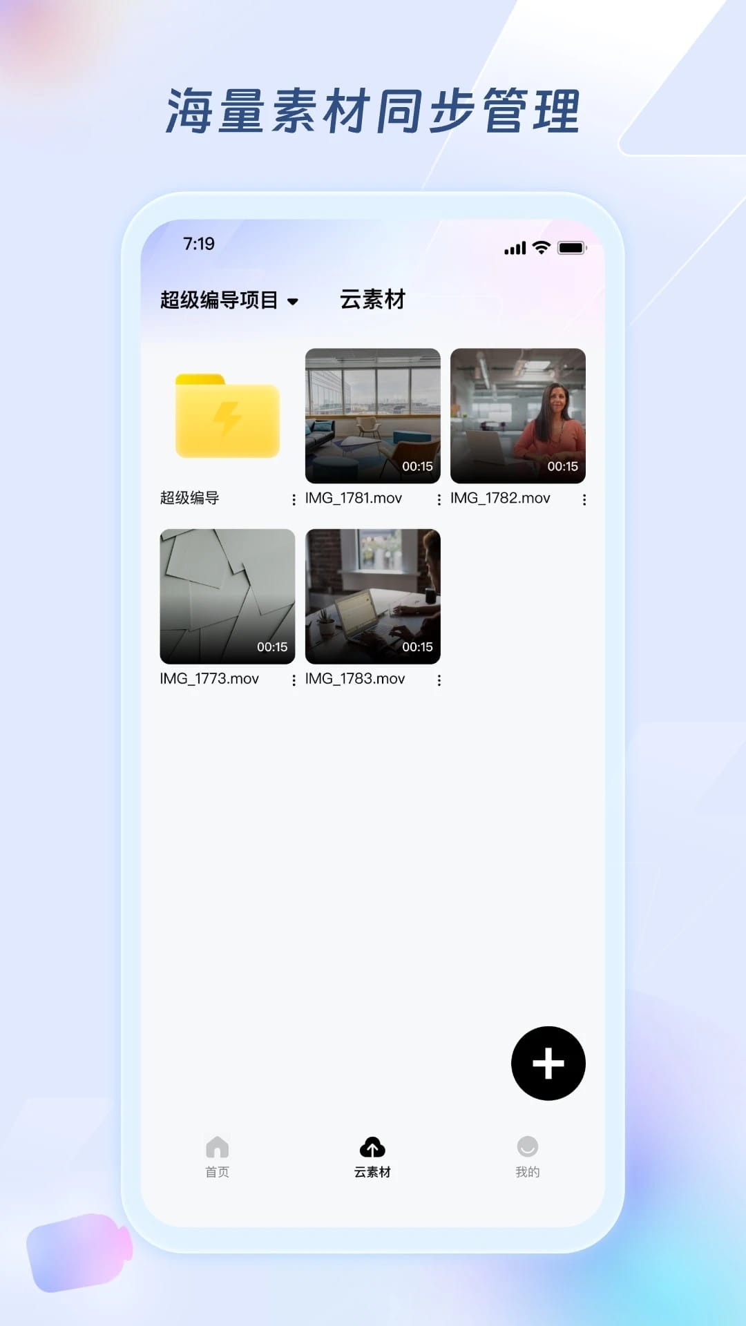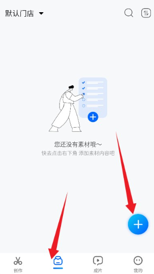4、在素材管理页面,通过底部添加按钮导入设备存储中的多媒体文件