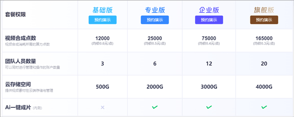 目前有基础版、专业版、企业版、旗舰版四种套餐,收费标准如下表