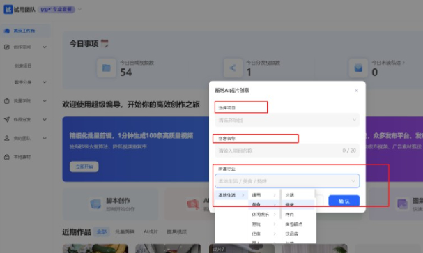 3、选取"智能视频生成"功能,创建新项目时需要输入创意文案并选择对应的行业领域