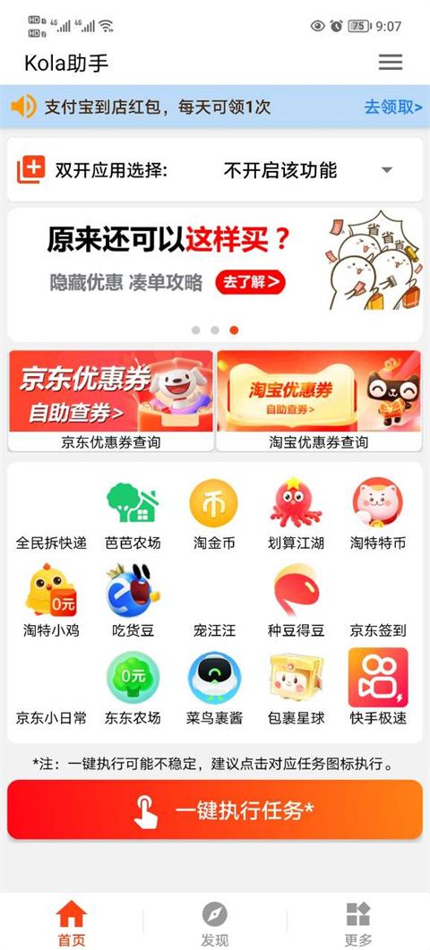 kola任务助手最新版是一款可以自动完成京东淘宝活动任务的辅助工具,不需要用户花费太多时间,只需要点击几下就能够快速刷完各种优惠活动,让用户在最短的时间内获得更多的优惠。
